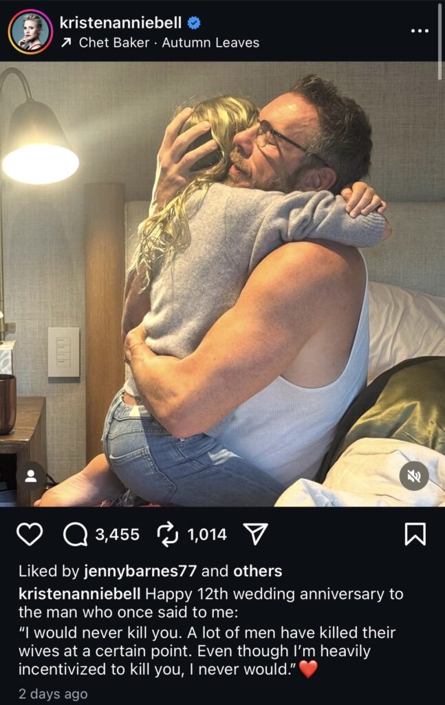 Kristen Bell’s anniversary tribute to Dax Shepard was meant to be sweet, but the internet quickly turned it into a spectacle. The “Veronica Mars” star marked twelve years of marriage with an Instagram post that featured a photo of her and Dax together, captioned with a quote from her husband that read, “I would never kill you. A lot of men have killed their wives at a certain point. Even though I’m heavily incentivized to kill you, I never would.”